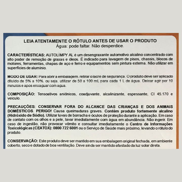 1. Dilua 50 a 100 mL de AUTOLIMPY para cada 1 litro de água, dependendo da superfície a ser limpa e da intensidade da sujeira e/ou oxidação;